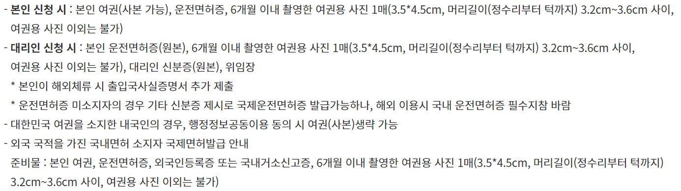 준비물은 신분증 (주민등록증, 여권), 유효한 국내 운전면허증, 여권용 사진 1매, 발급 수수료가 필요합니다. 대부분 국내 일반 운전면허증 소지자라면 발급할 수 있습니다.