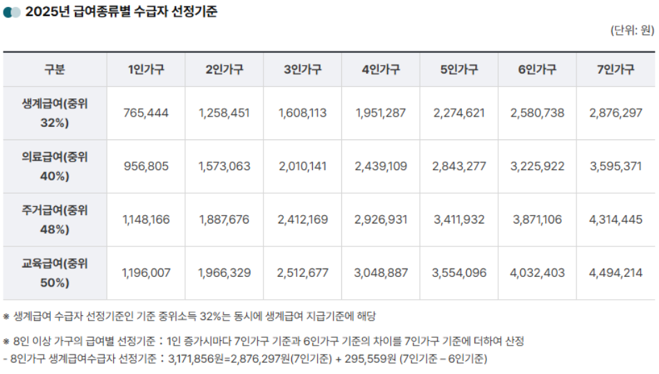 기초생활수급자가 되기 위해서는 몇 가지 필수 조건을 충족해야 합니다. 크게 보면 소득 인정액, 재산 수준, 부양의무자 기준을 포함한 세 가지 요소가 핵심입니다. 2025년 기준으로 생계급여 수급자격은 중위소득 32% 이하, 의료급여는 40% 이하, 주거급여는 48% 이하, 교육급여는 50% 이하의 소득을 충족해야 합니다. 과거에는 엄격했던 부양의무자 기준도 대부분 폐지되어 수급자 선정 폭이 넓어졌습니다. 하지만 특정 고소득·고재산 부양의무자가 있는 경우는 여전히 제한이 있을 수 있습니다.