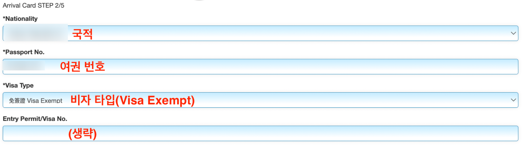 - 비자 종류는 Visa-Exempt로 입력하고 국적은 Korea, Republic of로 입력하세요.