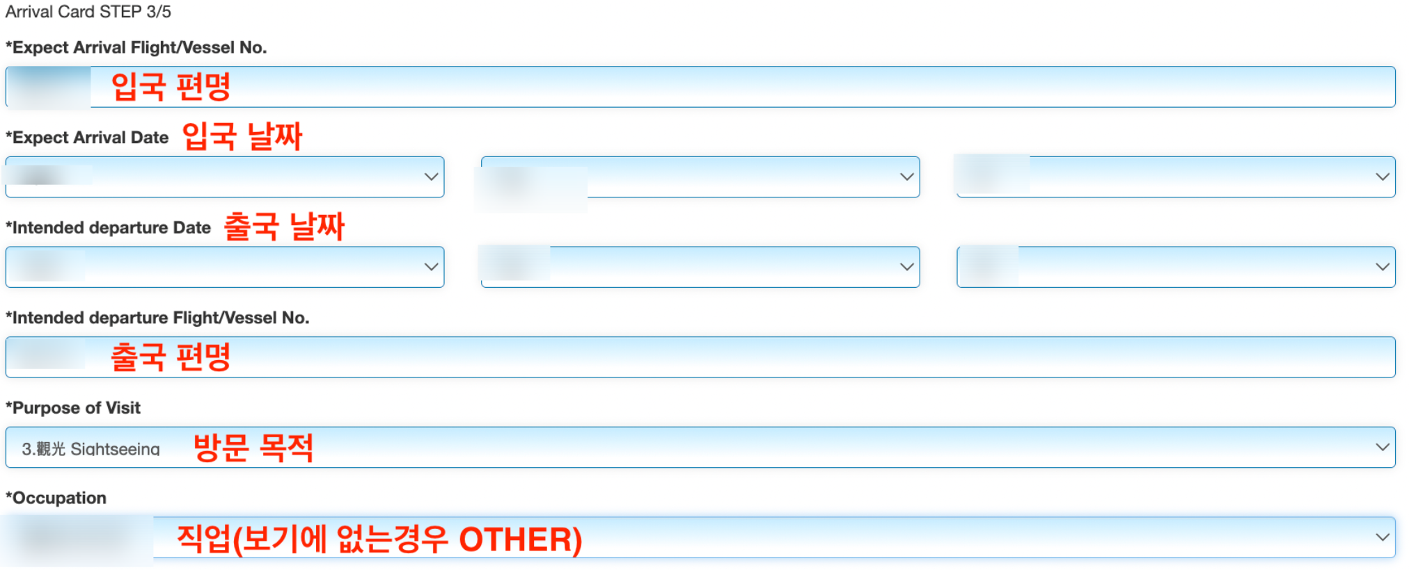 - 입국 편명, 날짜, 출국 편명, 날짜 그리고 방문 목적, 직업을 선택합니다.