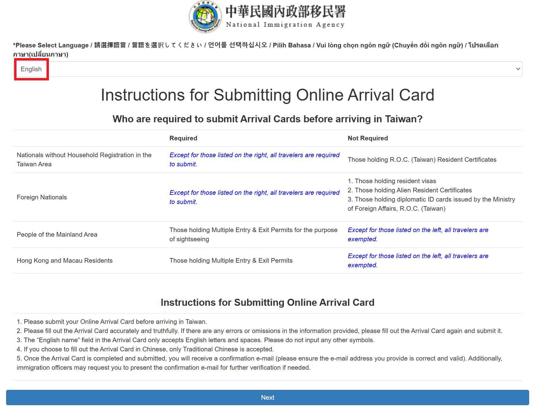 대만 온라인 입국신고서로 접속하면 언어를 선택한 후에 개인정보를 작성하는 부분이 나옵니다.