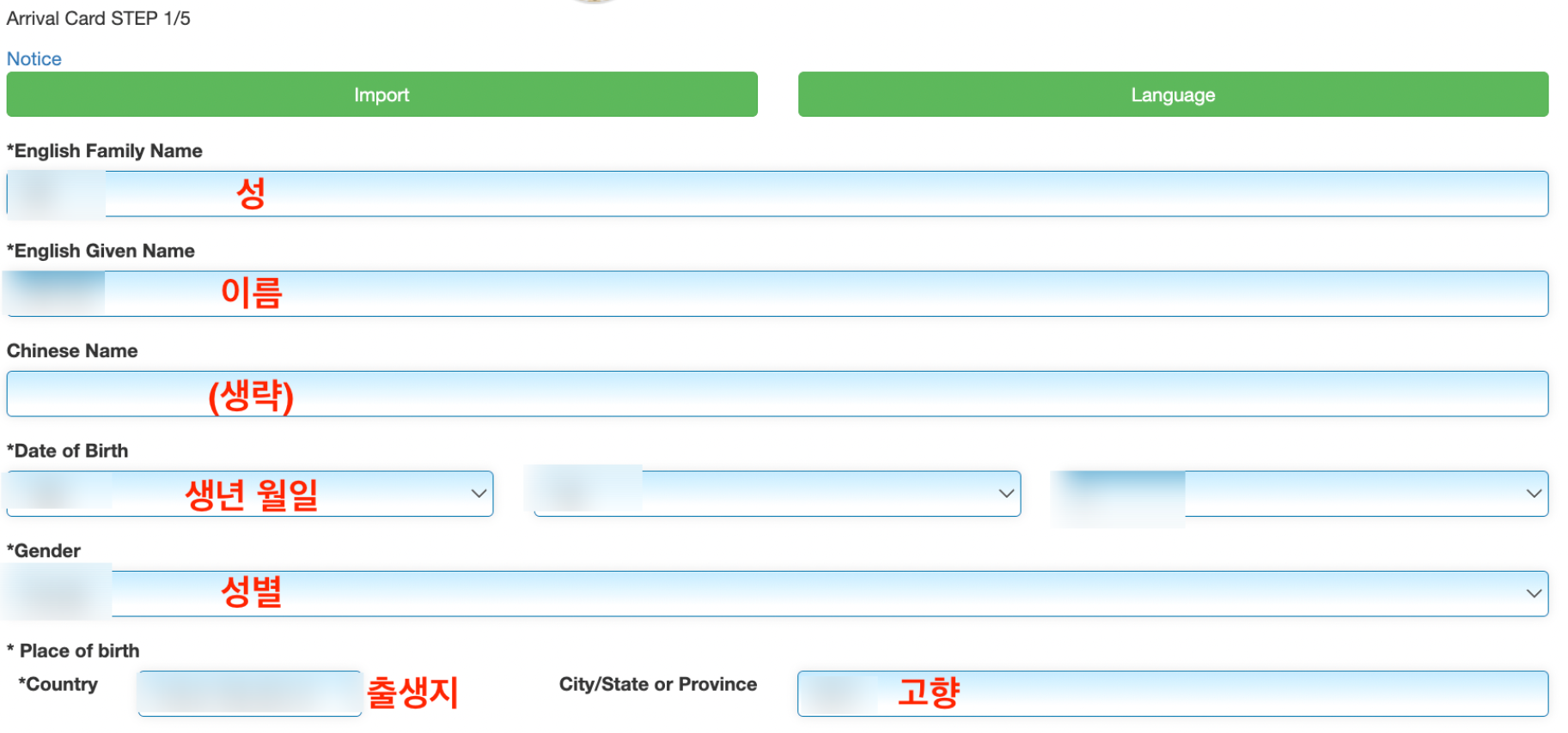 - 이름, 생년월일, 성별, 출생지 등을 작성합니다.