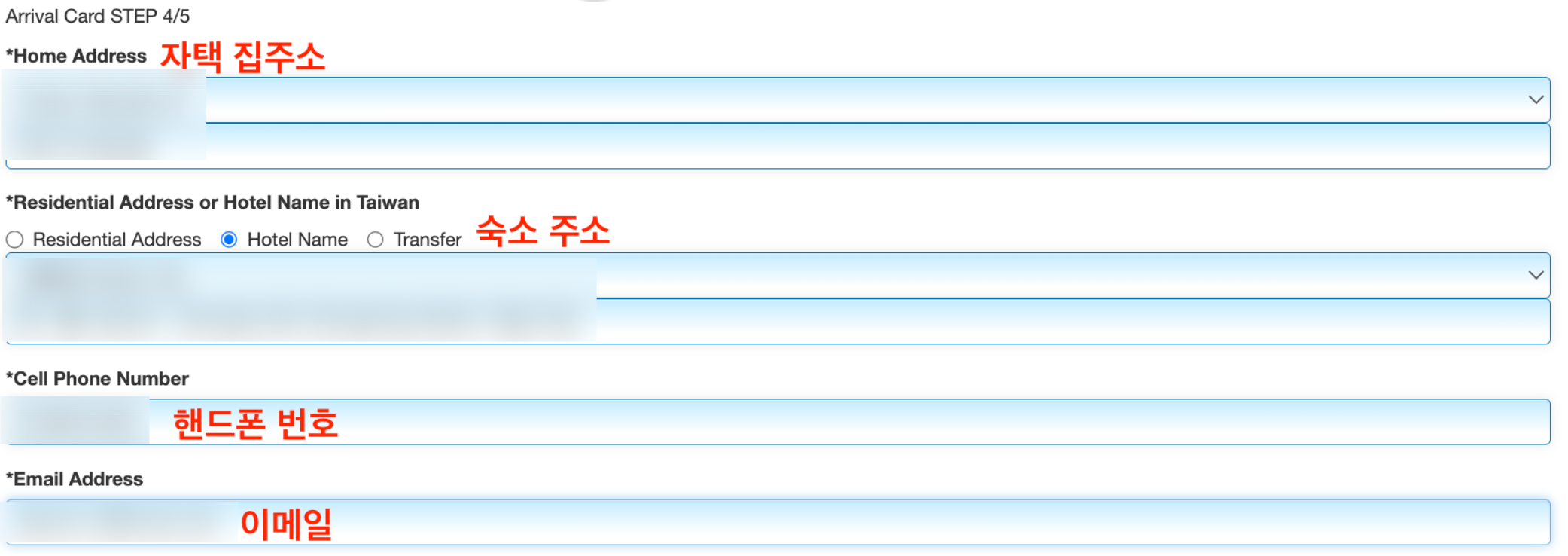 - 대만 체류 주소 및 연락처 기입