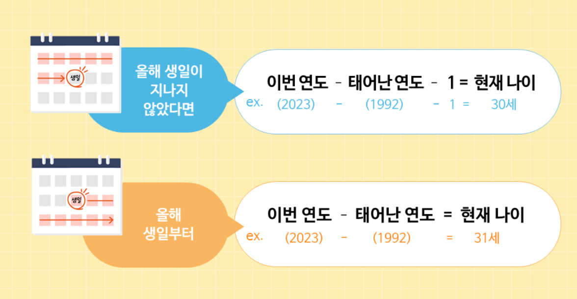 태어나면 0살 이번년도 생일이 지난 경우 ● 계산 : 이번년도-태어난 연도=생일이후 만나이 ● 예시 : 2025년-2005년=만 20세 |