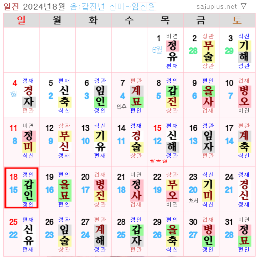 일진이 사납다라는 말 들어보셨죠. 일진은 일운을 의미하며 한달의 운을 위의 달력에서 확인할 수 있습니다.