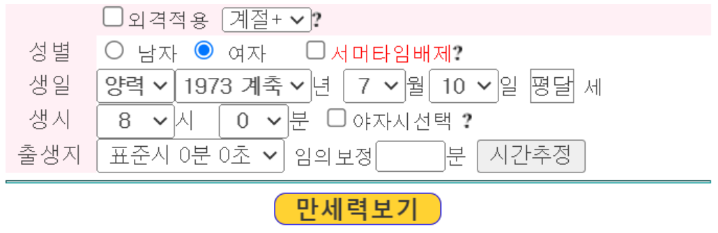 무료 사이트에 접속하면 아래와 같이 성별, 생일, 생시, 출생지 등을 입력하는 란이 나옵니다. 여기세 입력을 하시고 노란버튼 만세력보기를 클릭합니다.