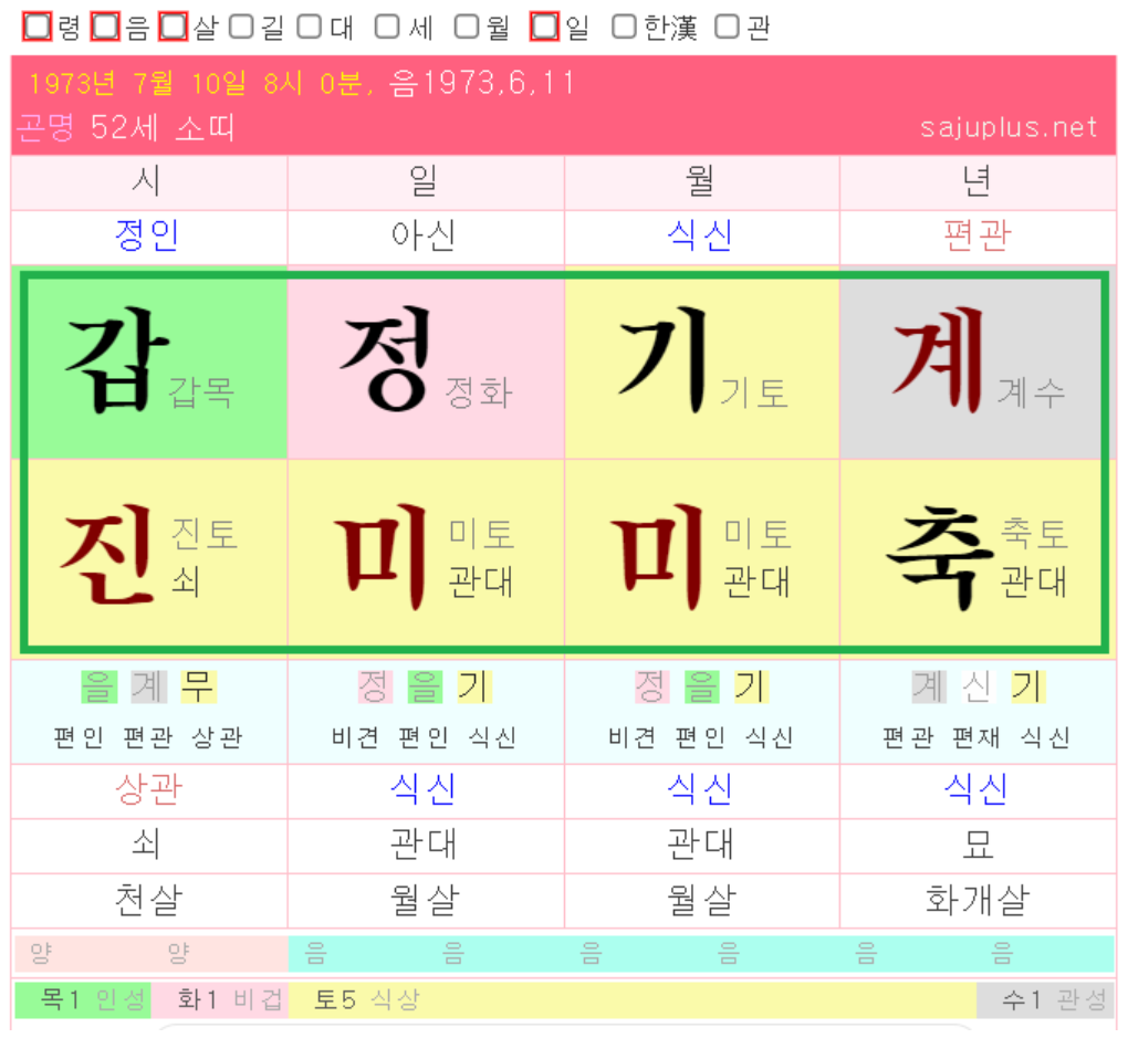 네모난 초록색 칸 안에 있는 8개의 글자는 60갑자표 체계와 내 사주가 조합되어 나온 것입니다. 시/일/월/년이라고 적혀있는 이것은 의미를 각각 다르게 내포합니다.