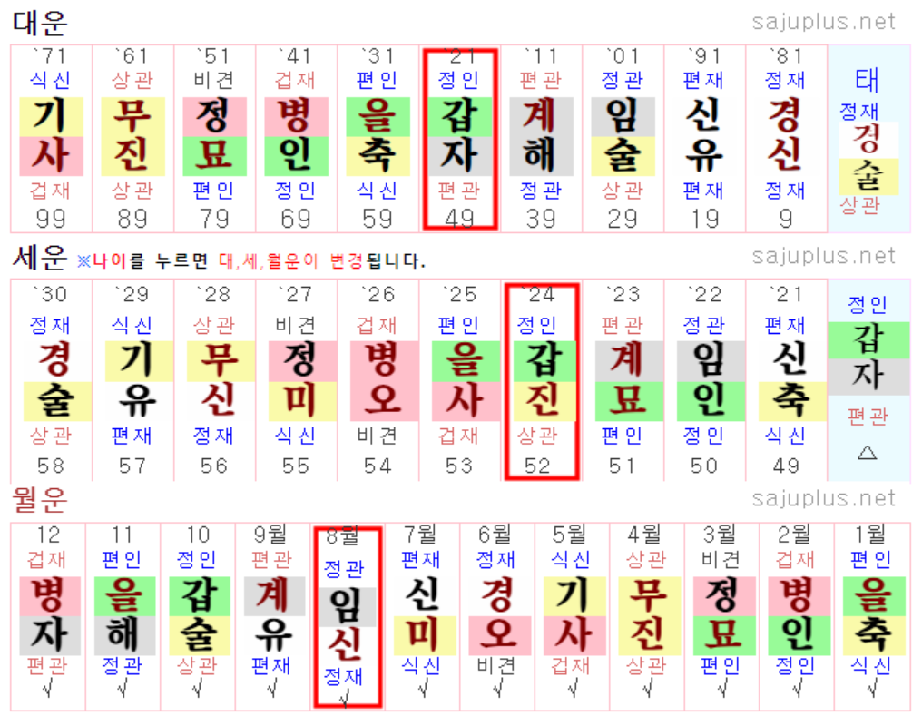 아래 내리다보면 대운이 나오는데 이것은 10년마다 오는 운을 말하고, 세운은 1년마다 오는 운, 월운은 매달 오는 운을 뜻합니다.