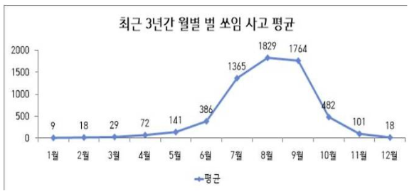 벌쏘임 사고가 많이 일어나는 시기는 6월에서 9월 사이입니다. 특히 8월 1,829건과 9월 1,764건이 발생해 전체 57.8%를 차지합니다. 야외활동시 또는 벌초시에는 사고가 빈번하게 일어나므로 주의하셔야 합니다. 사고 발생장소는 1,049명이 집에서 벌에 쏘였다 밝혔고, 바다와 강, 산, 논밭 순서대로 뒤를 이었습니다.