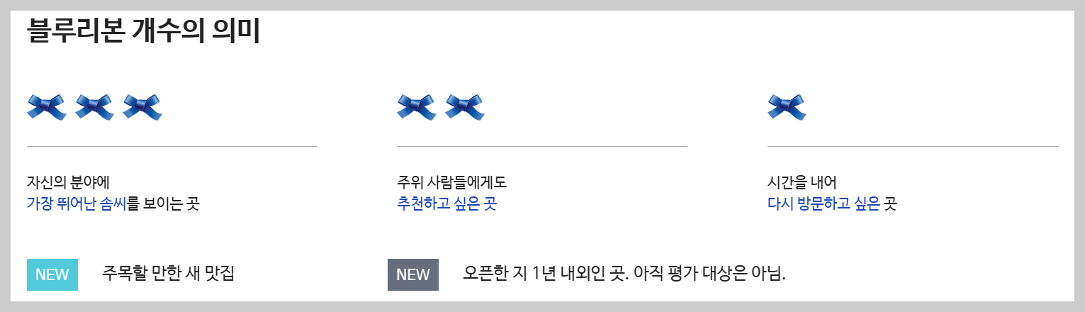 - 블루리본 스티커가 매장에 붙어 있어도 리본평가가 0개일 수 있습니다.