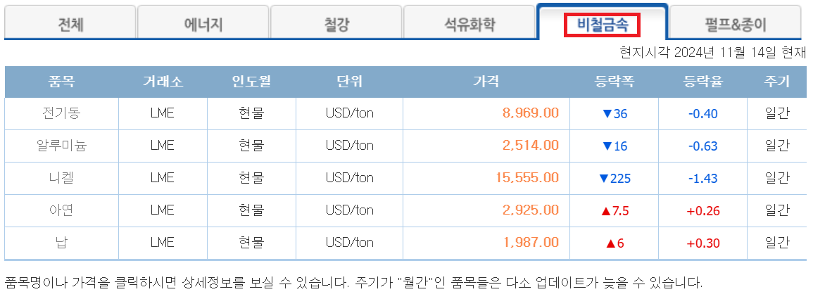 산업통상자원부 홈페이지의 원자재가격정보 메뉴를 통해 매일 비철금속 시세를 확인할 수 있습니다.