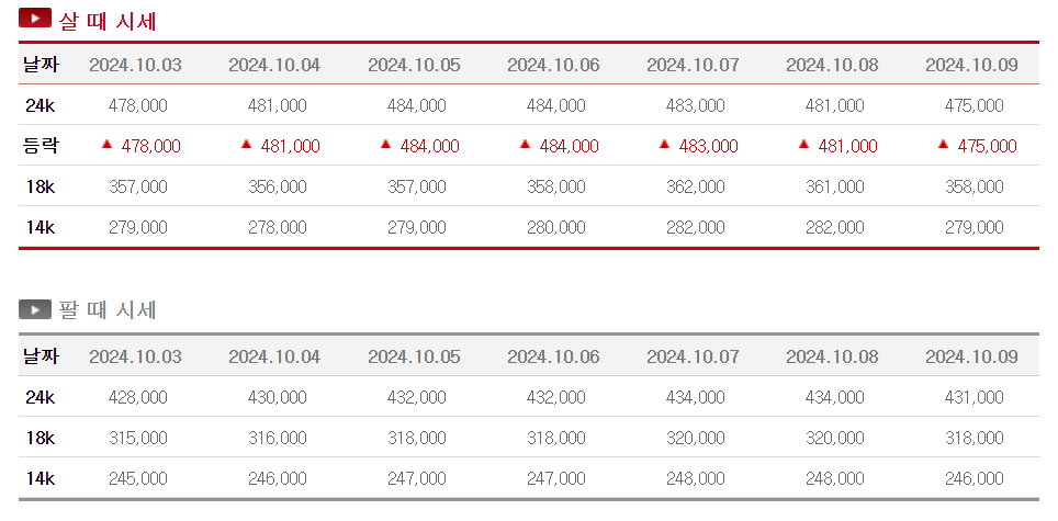 금 24K 순금 매입가 한돈 가격은 475,000원, 매도가 431,000원입니다. 금 18K 매입가 한돈 가격은 358,000원, 매도가 318,000원이며 금 14K 매입가 한돈 가격은 279,000원, 매도가 246,000원입니다.