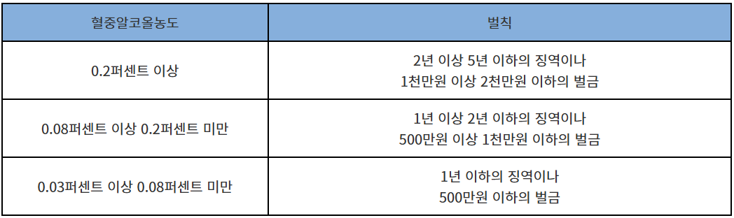 - 혈중알코올농도 0.2% 이상 : 면허 취소 (2년), 벌금 1,000만 원 이상 또는 징역형
