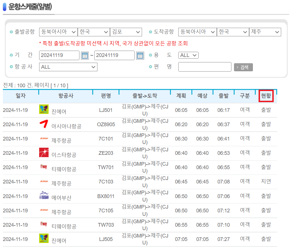 실시간 운항정보에서 각 항공사에 대한 결항, 지연, 출발 등의 현황 정보를 알 수 있습니다.