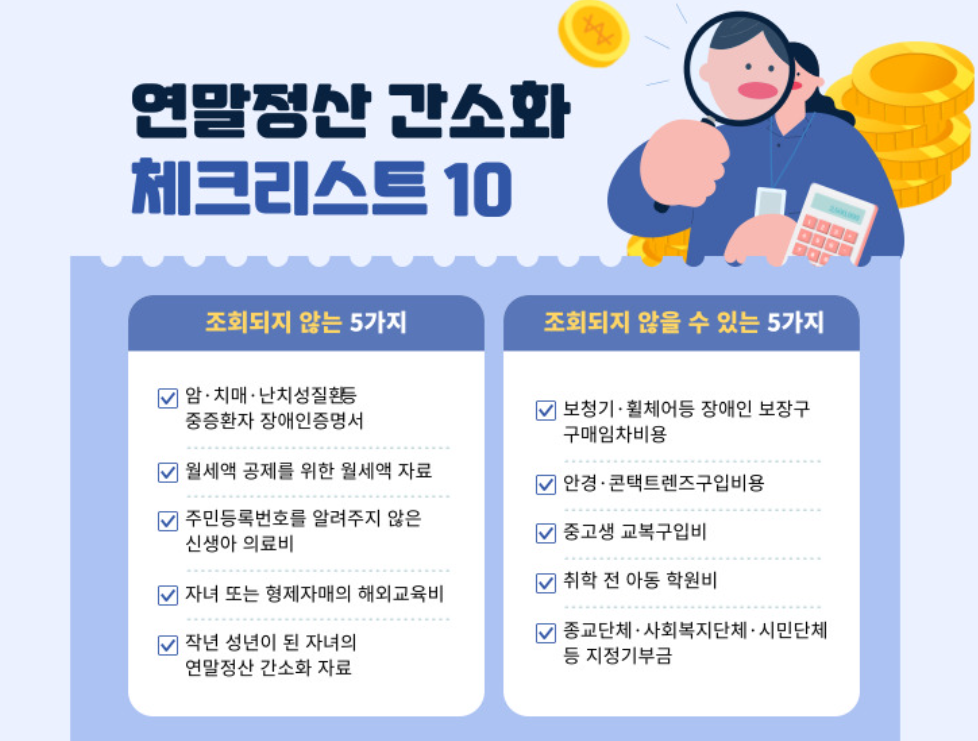 - 공제 항목 확인 : 의료비, 교육비, 보험료, 기부금 등 자신이 해당하는 공제 항목을 정확히 파악하세요.